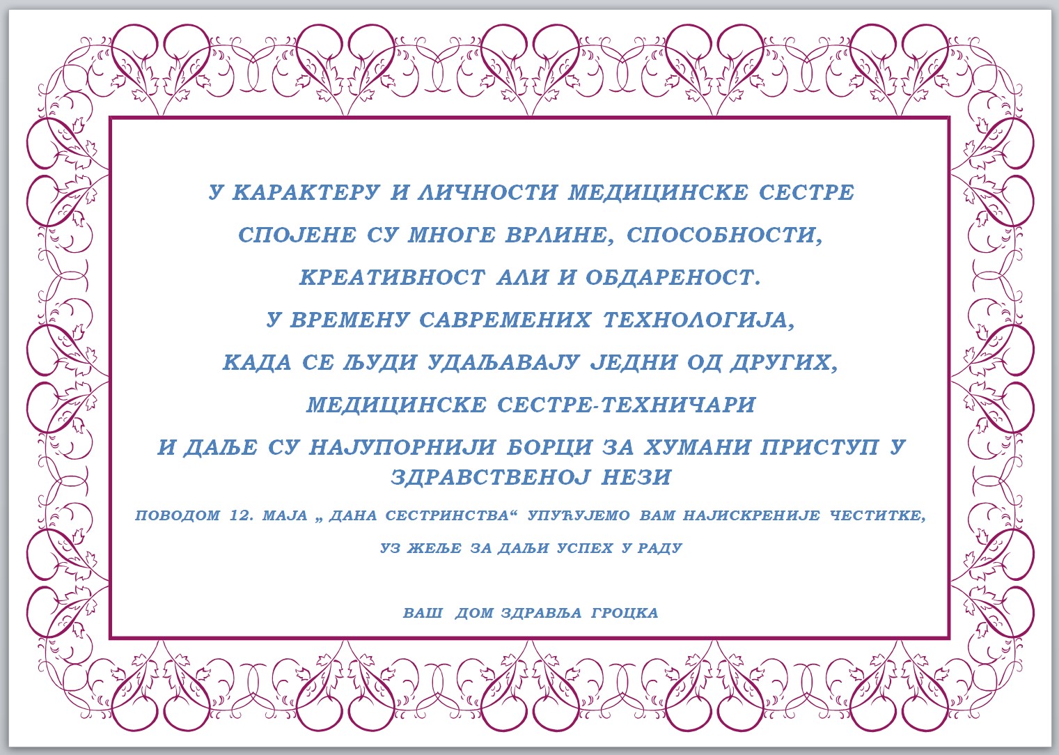 Дом здравља Гроцка подсећа грађане да се у среду 12. маја обележава Међународни дан сестринства, у част рођења Флоренс Најтингел – зачетнице савременог сестринства. Овогодишња тема дефинисана је…